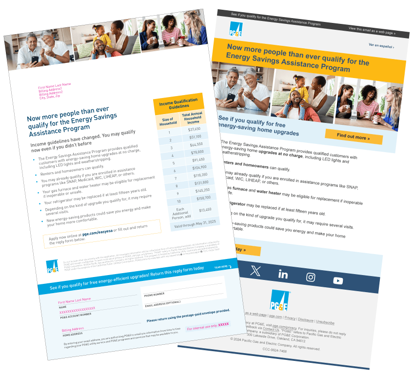 The Energy Savings Assistance (ESA) Program provides free energy-efficient home improvements to PG&E customers who meet specific income requirements, and own or rent a home that’s at least five years old. Previously, ESA was mailing on a quarterly basis. Now, due to the success of highly engaging program messaging and creative we worked on with Jascenth Edwards, the campaign strategy is being transitioned to monthly automated campaigns to ensure a steadier flow of applications in the pipeline. This allows implementers to better keep up with the demand being generated.