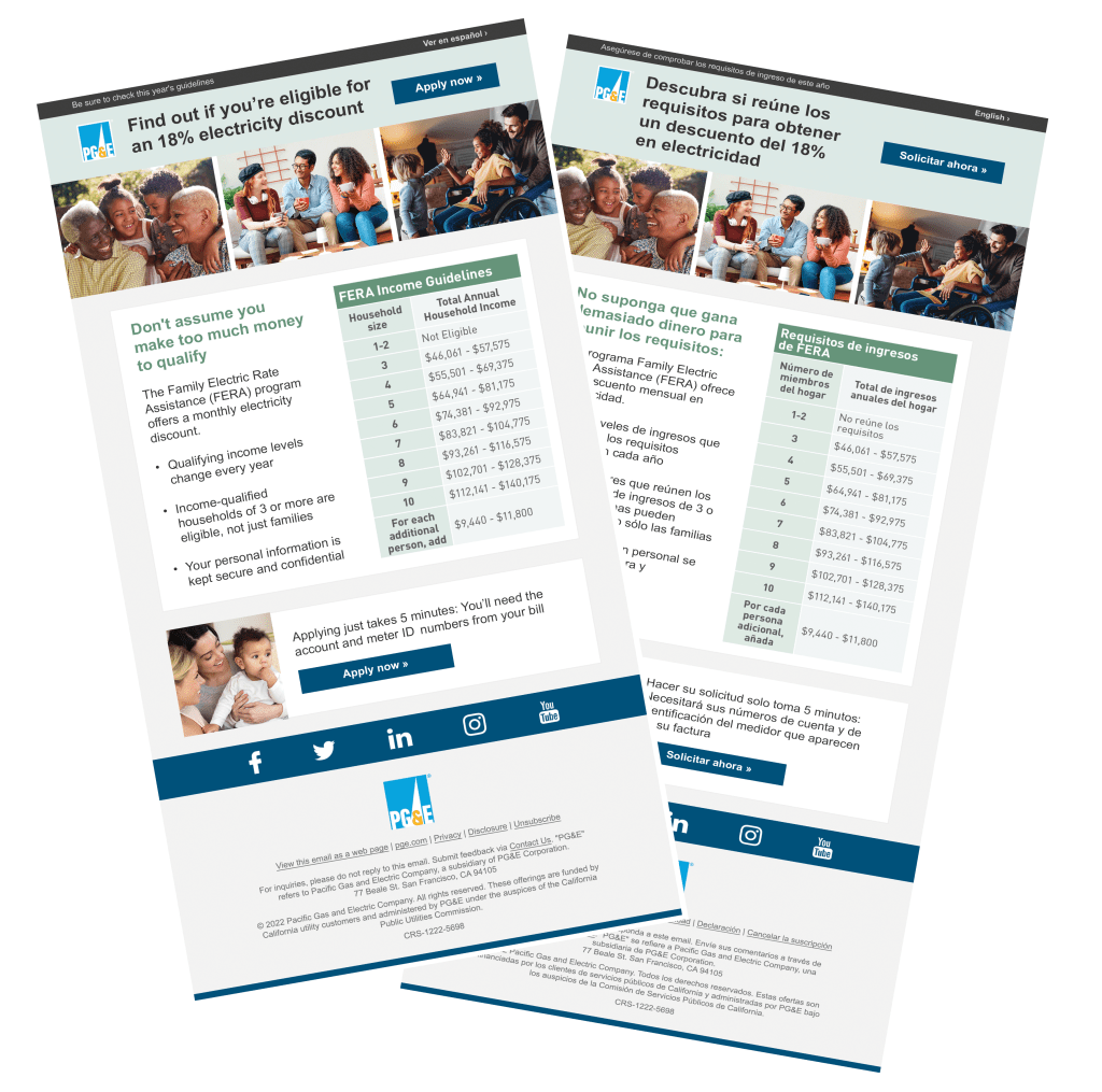 Activating customers who had not responded to many contacts about the Family Electric Rate Assistance (FERA) program was challenging. We worked with Hali Burbige and tested a variety of approaches. Finally, we found a challenging statement that broke through the noise: “Don’t assume you make too much money to qualify.” This proved very successful when we rolled it out. In fact, the FERA enrollment rate more than doubled the response rate from previous campaigns.
